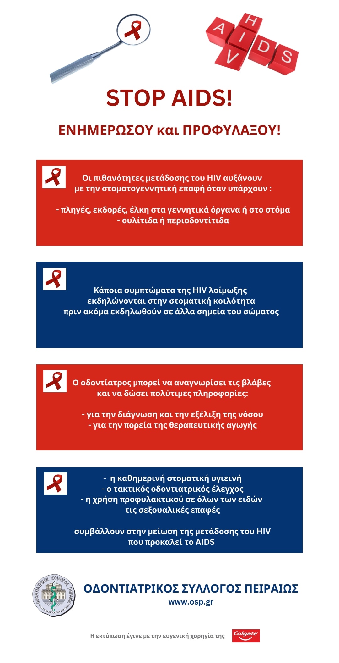 Στο πλαίσιο των συνεχών προσπαθειών για πρόληψη και προαγωγή της στοματικής υγείας, ο Οδοντιατρικός Σύλλογος Πειραιώς σε συνεργασία με τον ΕΟΔΥ οργανώνει προληπτική δράση για την Παγκόσμια Ημέρα κατά του AIDS στην Πλατεία Κοραή στον Πειραιά έξω από την είσοδο του Μετρό την Παρασκευή 1 Δεκεμβρίου 2023 και ώρα 10:00π.μ – 13:00μ.μ. Η δράση θα περιλαμβάνει ενημέρωση του κοινού από εθελοντές οδοντιάτρους του Οδοντιατρικού Συλλόγου Πειραιώς με διανομή φυλλαδίων για τον ιό HIV και το AIDS, με έμφαση στην σχέση της στοματικής κοιλότητας με την μετάδοση και την εμφάνιση των συμπτωμάτων του ΑΙDS και κεντρικό σύνθημα : “Προφυλακτικό πήρες. Οδοντόβουρτσα?..” Εκτός από τα φυλλάδια κατά την δράση θα μοιραστούν προφυλακτικά και οδοντόβουρτσες στους πολίτες. Η σκέψη για την δράση αυτή, προήλθε μετά από επισκέψεις της Προληπτικής Επιτροπής του Συλλόγου μας σε Λύκεια του Πειραιά για οδοντιατρικό έλεγχο και αγωγή στοματικής υγείας. Μέσα από συζητήσεις με τους μαθητές της τρίτης Λυκείου, διαπιστώσαμε ότι σχεδόν δύο στους τρεις δεκαοχτάχρονους εφήβους δεν γνωρίζουν την σημασία της στοματικής υγείας στην μετάδοση του ιού HIV , αλλά ούτε και την ανάγκη χρήσης προφυλακτικού κατά την στοματογεννητική επαφή. Με αυτή την διαπίστωση ως δεδομένο και κύριο σκοπό την πρόληψη, ευελπιστούμε στην κοινωνική ευαισθητοποίηση των Μέσων Μαζικής Ενημέρωσης και του Τύπου προκειμένου να προβληθεί το μήνυμα αυτό σε όλο τον ελληνικό πληθυσμό σε πανελλαδικό επίπεδο. Παρακαλούμε για την κάλυψη και την προώθηση αυτής της δράσης από το δίκτυο σας.